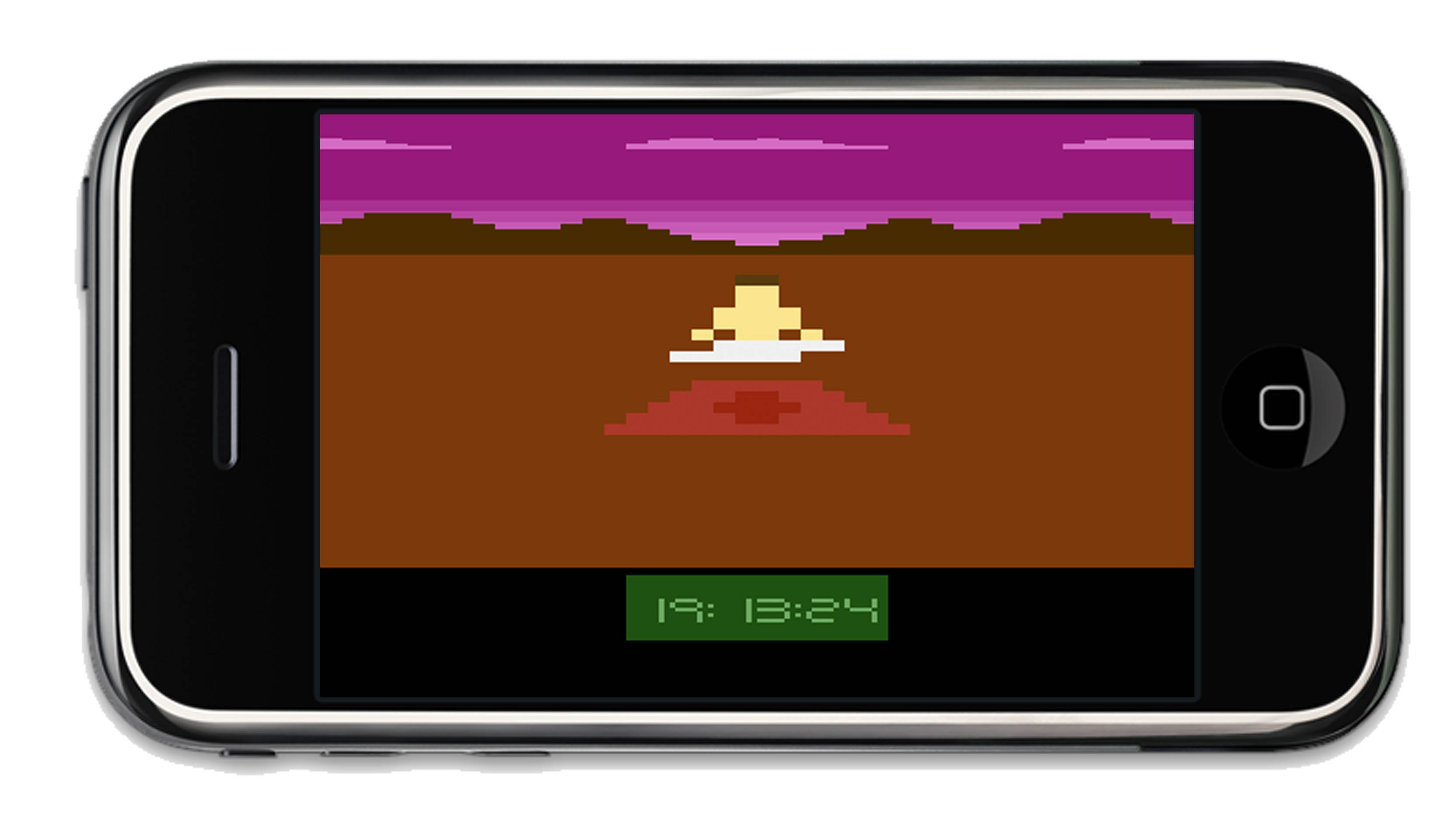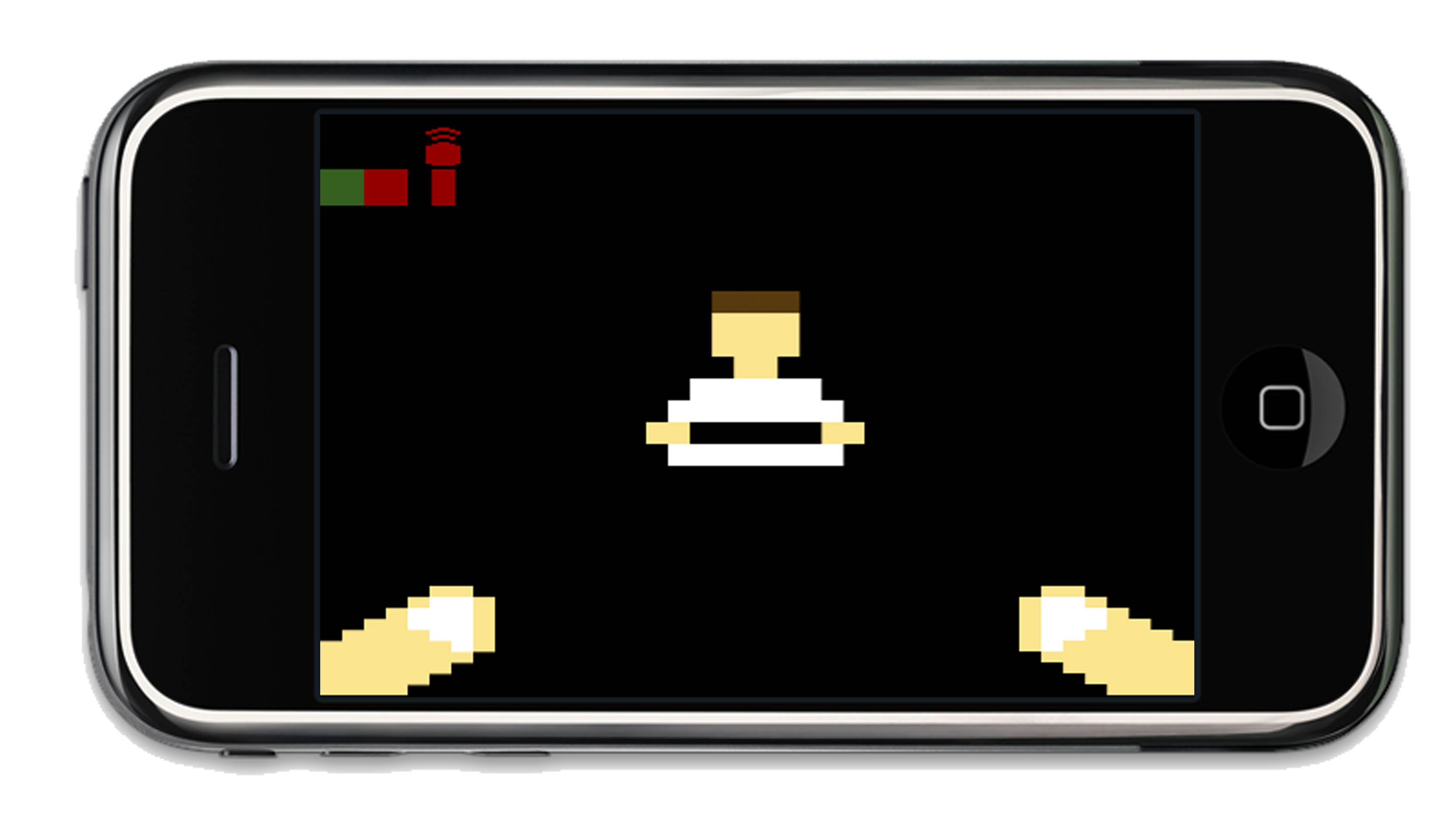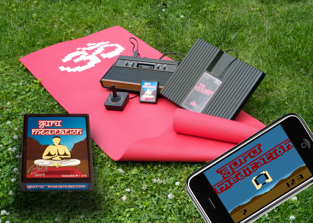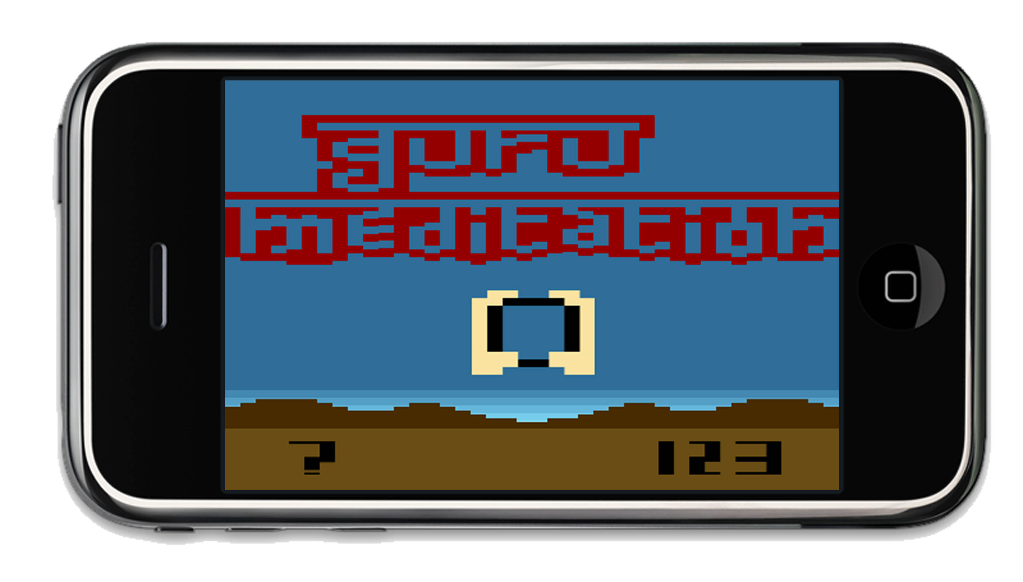 I’ve also ported the game to iPhone and iPod Touch to make it available to a “broader” audience. The iPhone edition of Guru Meditation is a port, not a reimagining. That is, it retains all the graphics, sounds, and gameplay of the Atari VCS original. Input was updated, however, and the game takes advantage of the iPhone’s similar (but more sophisticated) accelerometer, touch, and sound controls to encourage focus and inactivity. The iPhone edition also includes optional isochronic tones commonly used in “brainwave entrainment,” as well as the ability to disable microphone input in louder public environments. The mobile version also makes the game portable (useful for play at the office, on the couch, or on the go), as well as allowing the title to be experienced by a much larger playership than is possible with the Atari limited edition. Even more than the Atari, the iPhone offers a unique opportunity for a true relaxation game, since it makes such constant demands on our attention—telephone, email, text messages, Twitter, etc. Guru Meditation for iPhone literally makes it impossible to pursue other activities while playing. As such, it offers a convenient secondary commentary on the often overwhelming values of “connection” that today’s portable communication devices embrace.