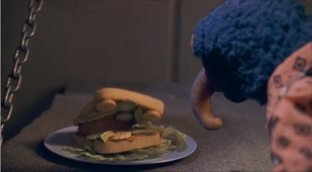 What is even going on? The sandwich is both the muppet’s mouth and the thing that maybe it’s eating, inside the mouth. The bananas (?) are both food to be eaten and teeth. It’s just horrific, but also totally normal. I mean, if you were a sandwich the stuff between the bread would be your mouth, and that would mean that the food you ate would commingle with the food that is your mouth and—gah!
