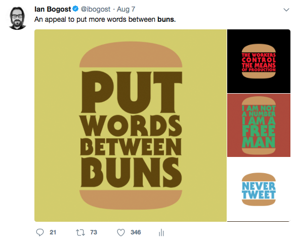 It occurred to me one summer day: It’s really nice when word are typeset between buns. I remarked upon this fact on social media: